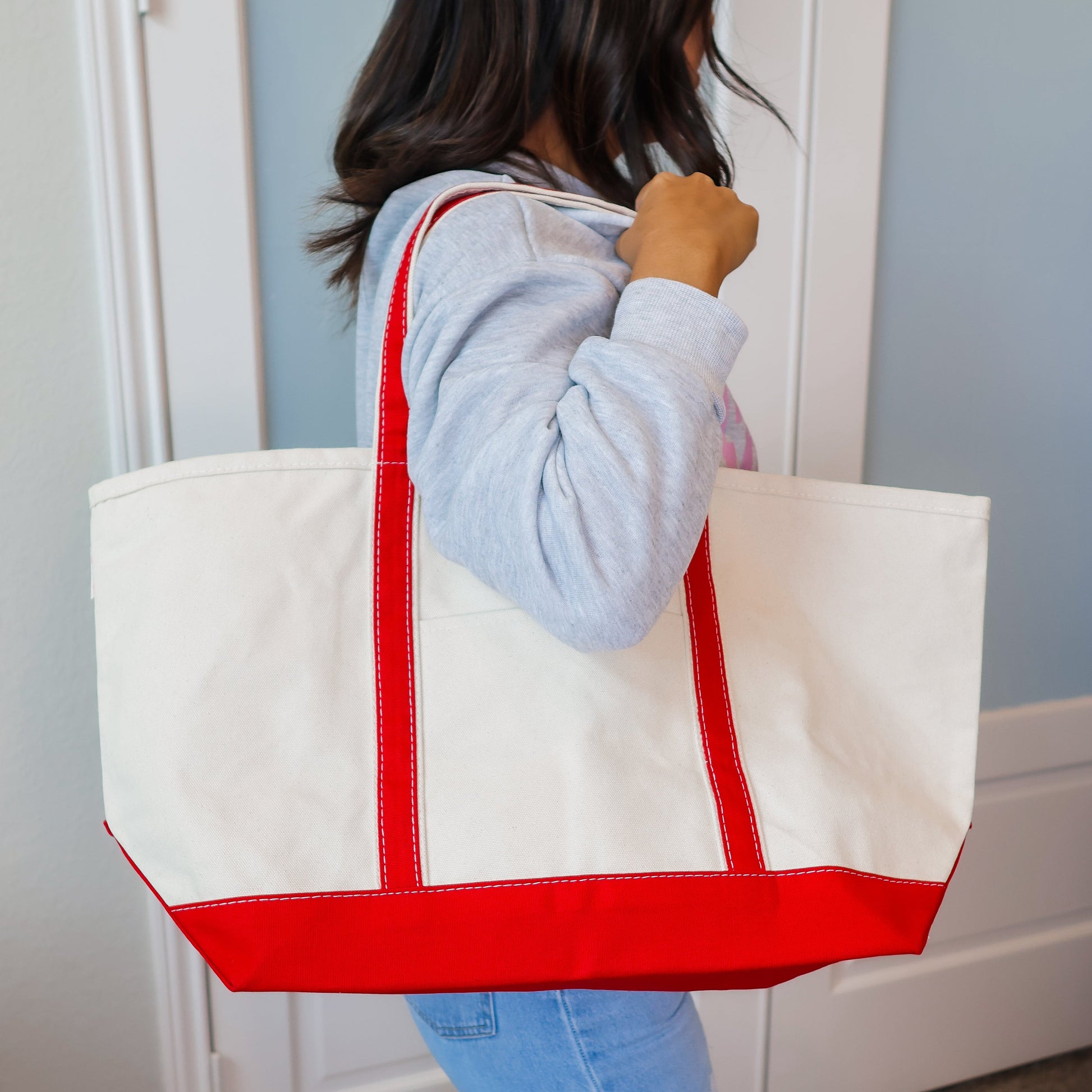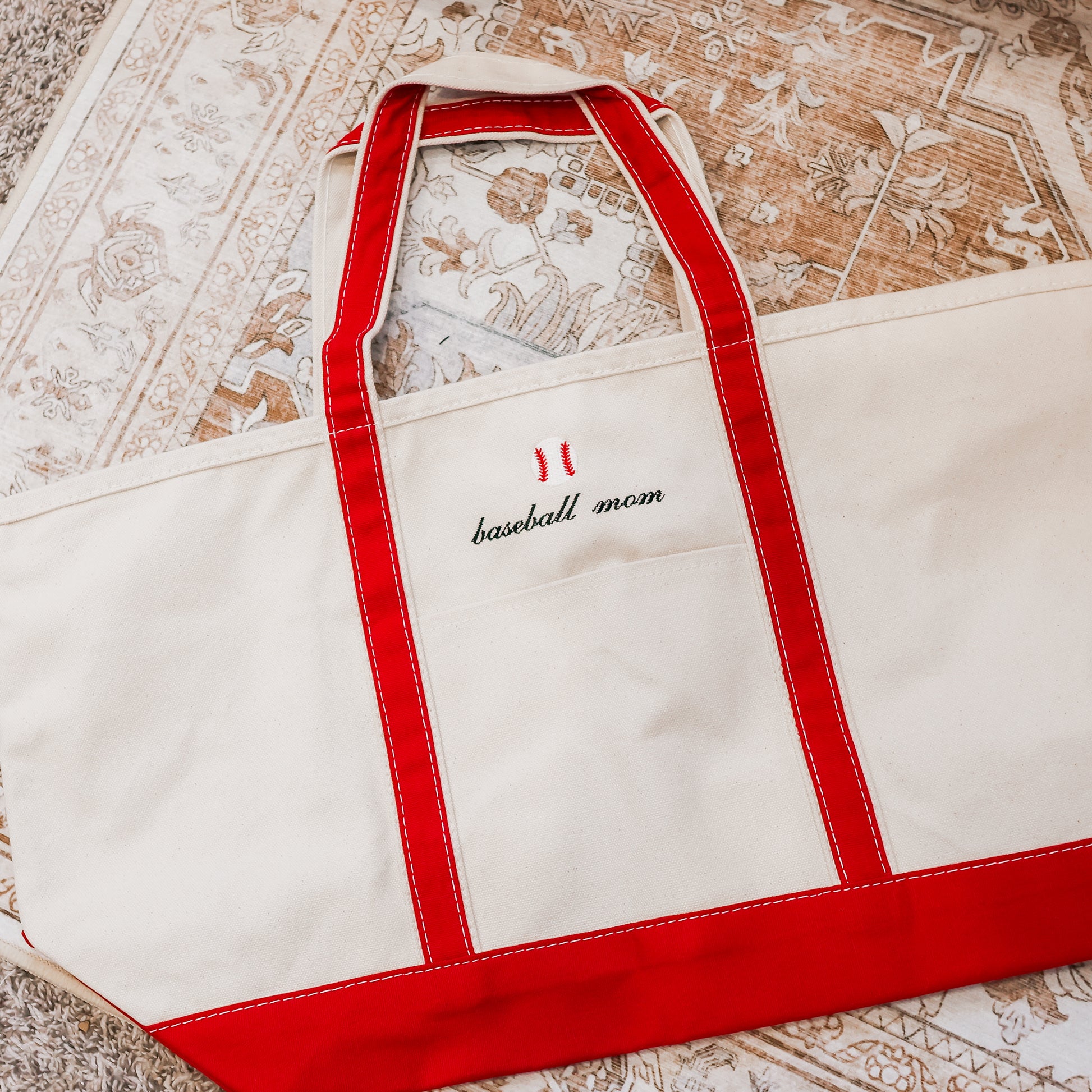 Show your baseball pride in bold style with this large red canvas tote. Designed for busy baseball moms, it features a beautifully embroidered baseball paired with the classic “Baseball Mom” expression for a standout look.