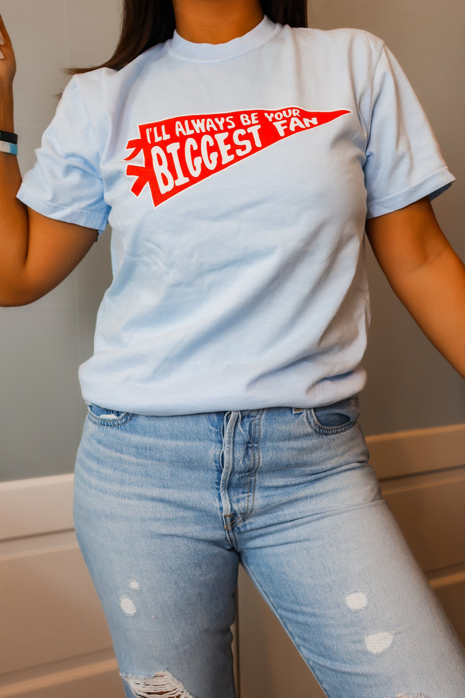 This Comfort Colors tee in light blue features a bold red pennant flag that reads “I’ll always be your biggest fan.” Made with that signature soft, lived-in feel, it’s the perfect graphic tee for game days, errands, or cheering from the sidelines. Comfortable, timeless, and full of heart—just like your biggest-fan energy. Brand: Ruby's Rubbish logo on the back.