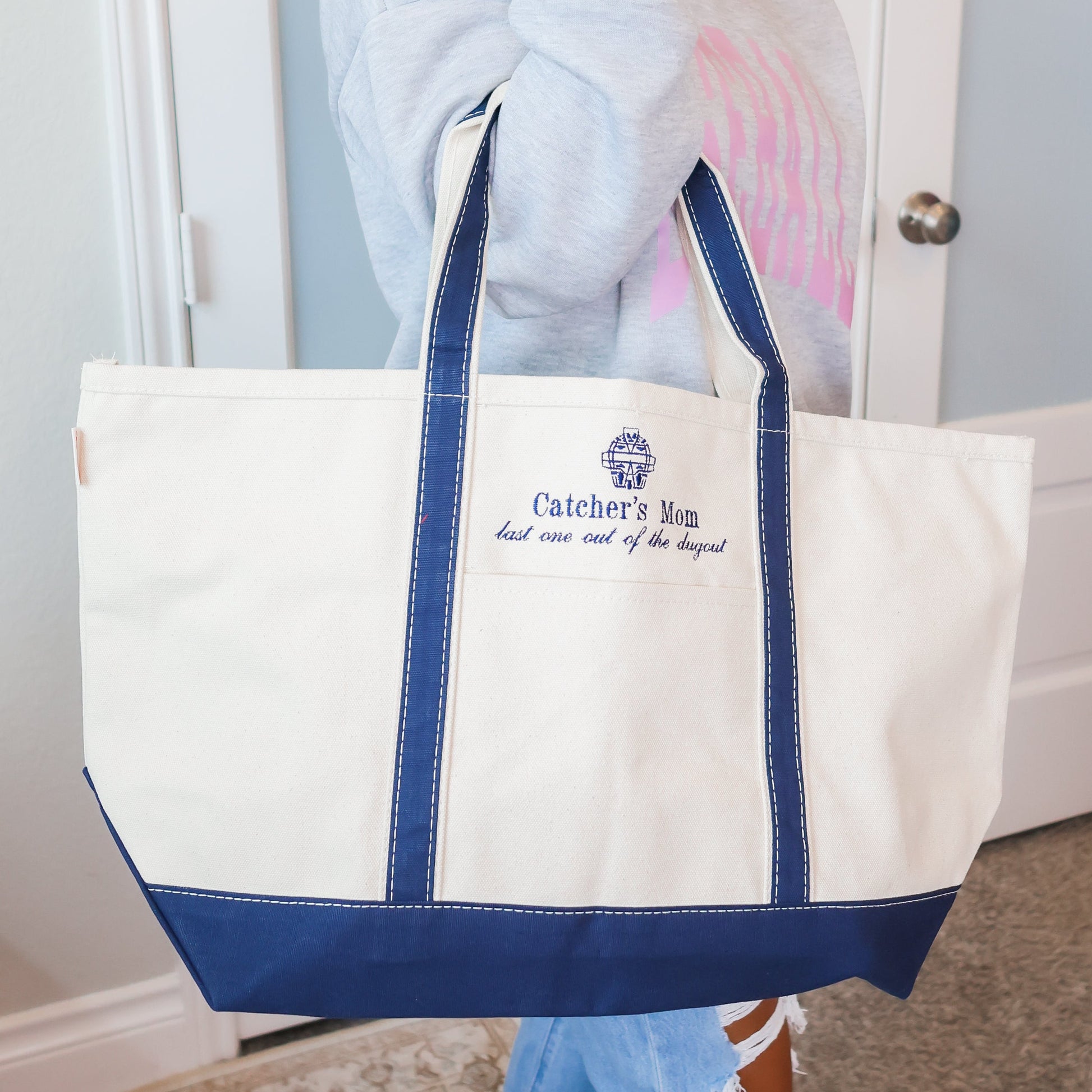 Carry your baseball-life essentials in style with this spacious navy tote featuring elegant tone-on-tone embroidery. “Catcher’s Mom – Last One Out of the Dugout” is stitched in rich navy thread, paired with a detailed embroidered catcher’s mask for the perfect finishing touch.