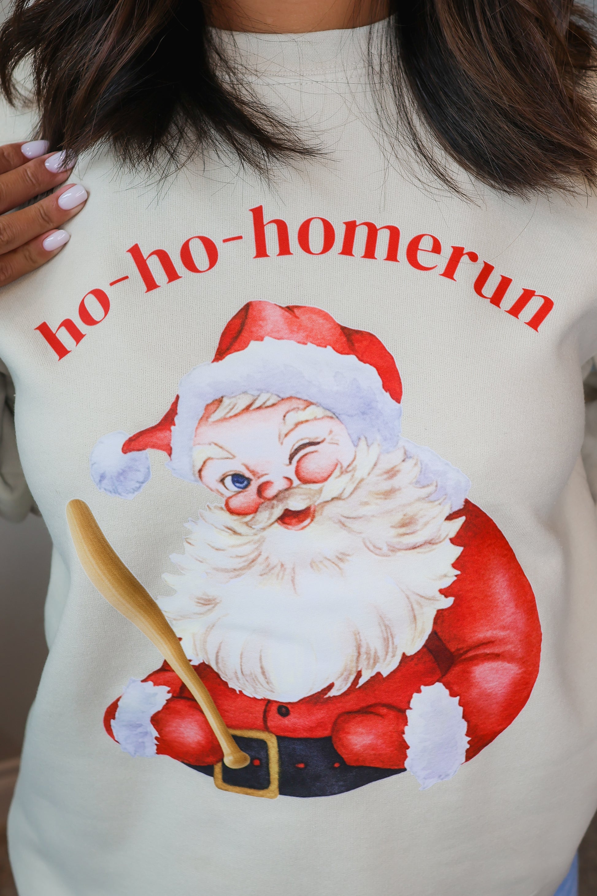 Sand-colored sweatshirt featuring a festive Santa holding a baseball bat. Soft, cozy fleece with a relaxed unisex fit. Perfect for baseball lovers, holiday events, team parties, or gifting.