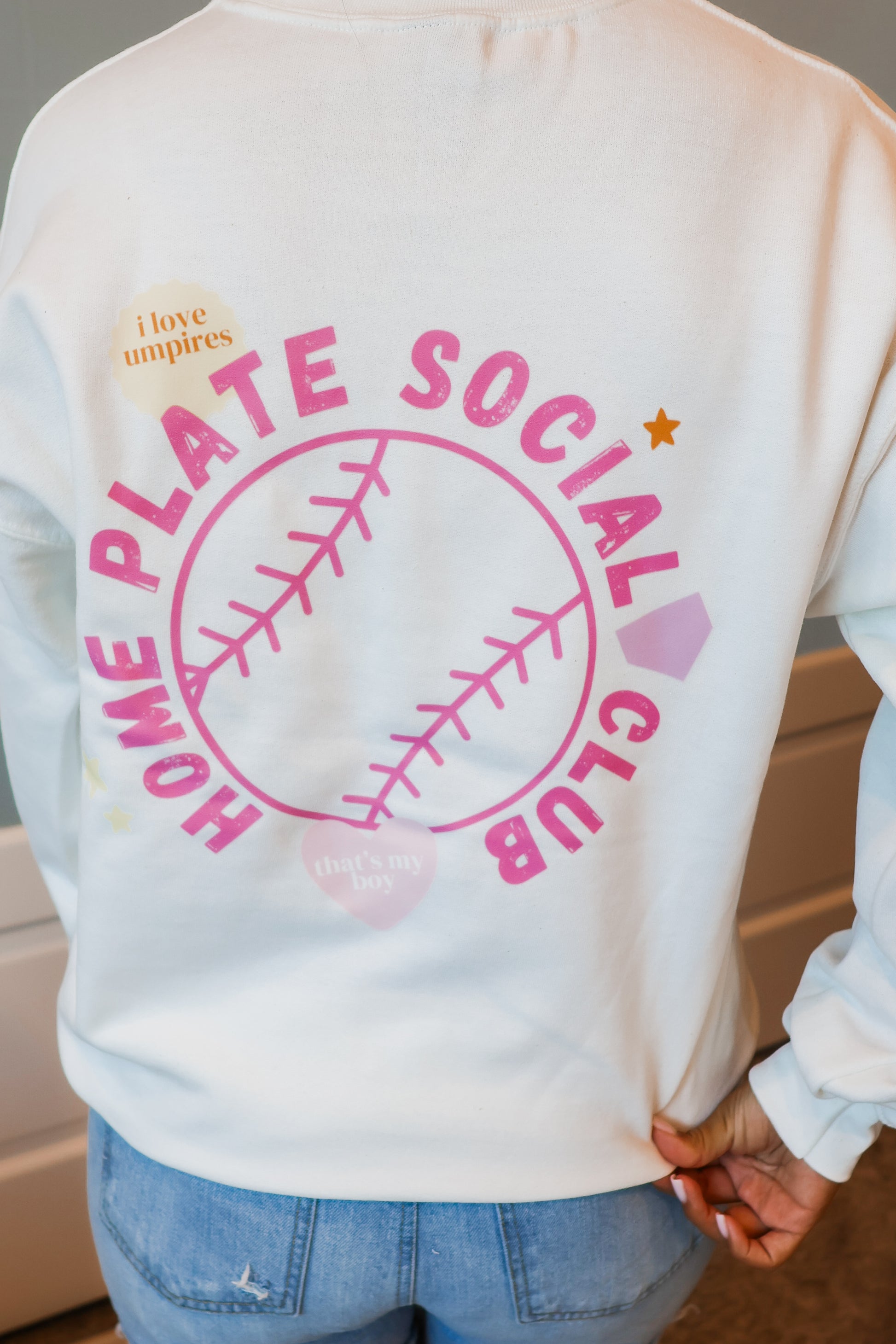 Meet the HomePlate Social Club sweatshirt: crisp white, soft pink lettering, and the statement proudly printed on the back — “I love umpires and that’s my boy.” Cozy, cute, and made for every baseball mom moment.