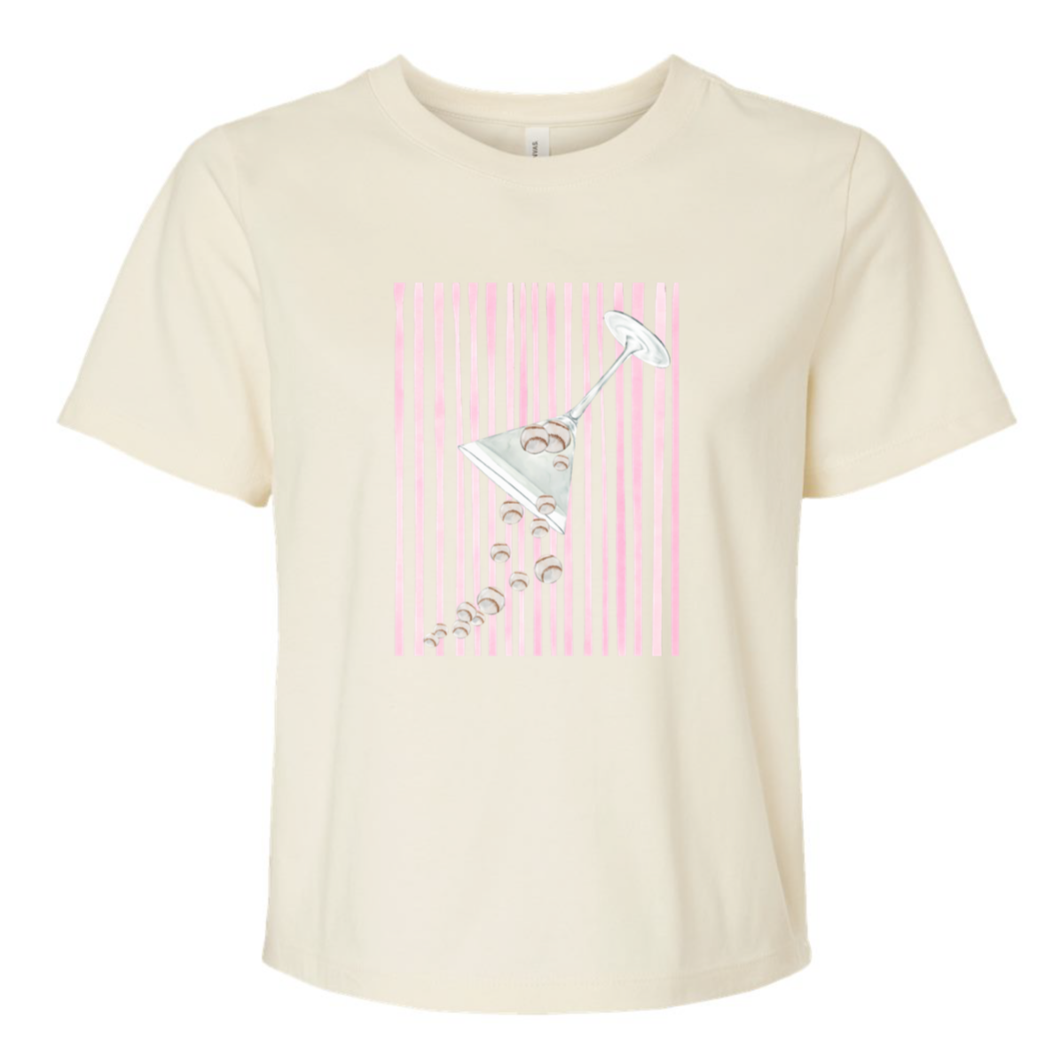 The Olive Baseballs tee features a fun martini glass graphic with baseballs spilling out over pink stripes for a playful, sporty vibe. Printed on a 100% cotton Bella + Canvas boxy tee in natural, it’s soft, relaxed, and perfect for everyday wear.