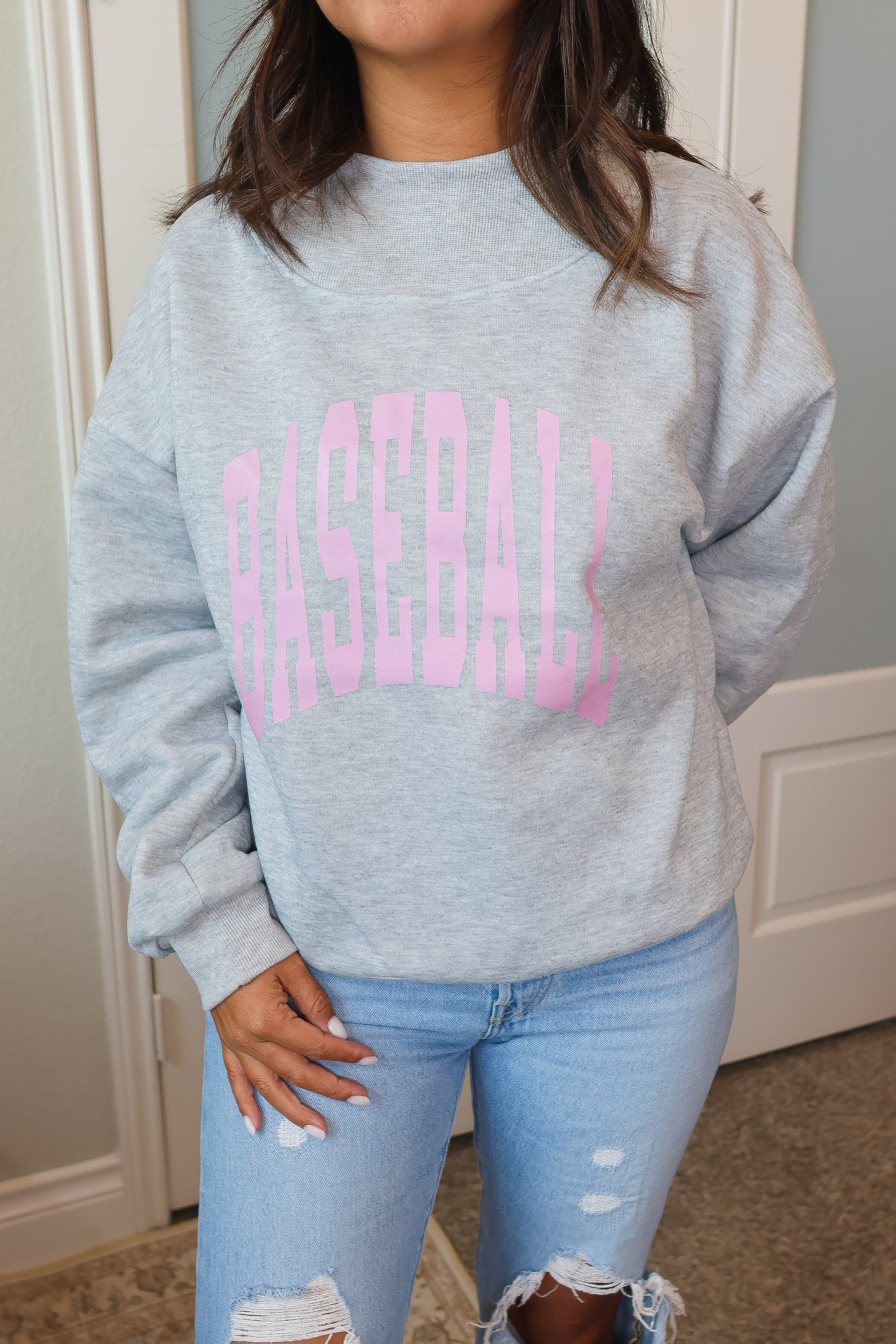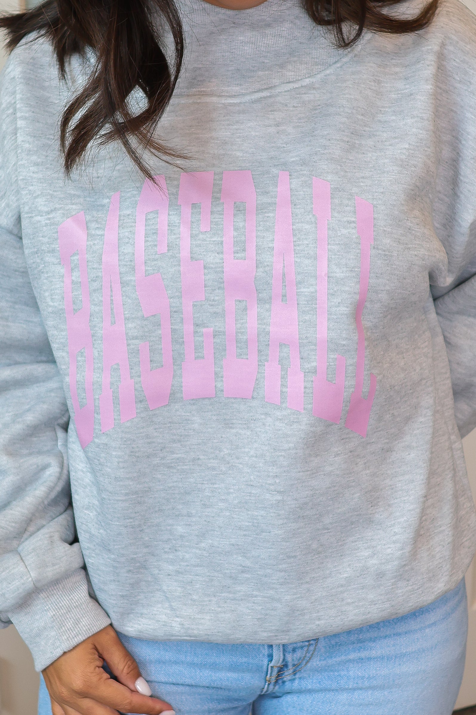 A lightweight, fleece-lined ash gray mock neck sweatshirt made with 95% polyester and finished with “baseball” in soft pink across the front—perfect for cozy game days and baseball moms on the go.