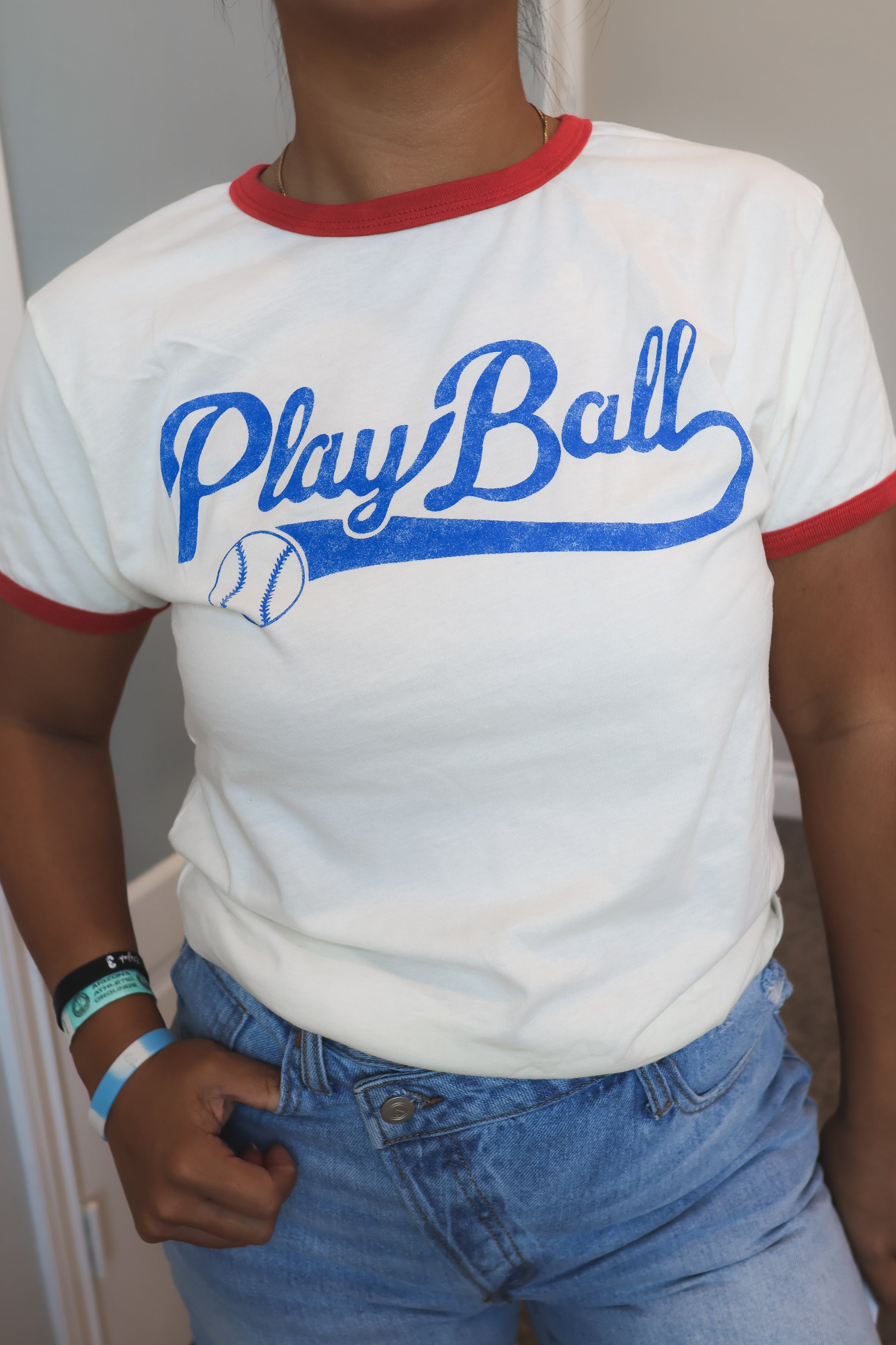 Game day ready. This 100% premium cotton tee features bold blue Play Ball lettering and red ribbed collar and sleeves for a sporty, vintage feel. Soft, breathable, and perfect for every baseball-loving day.