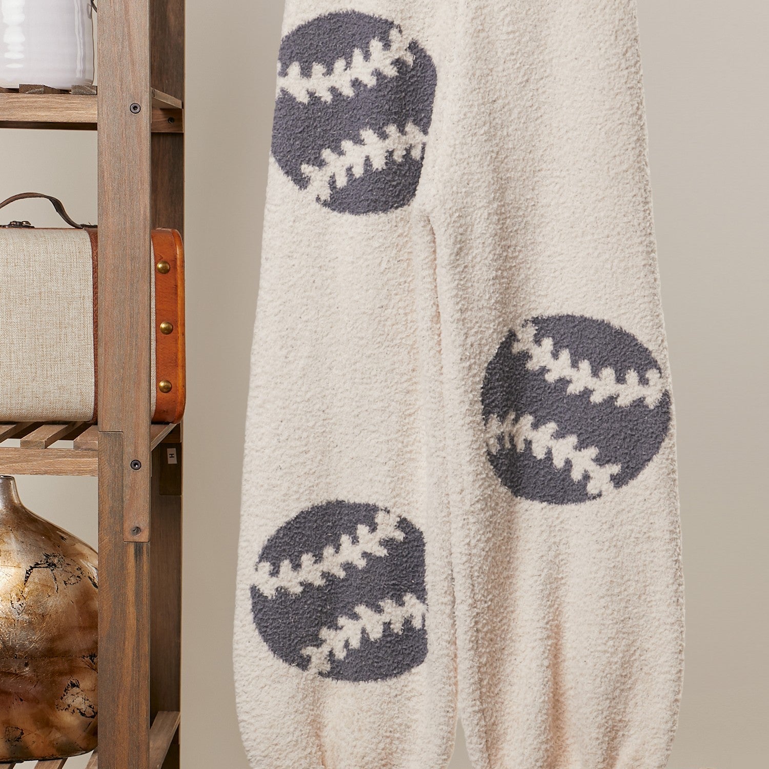 These ivory cozy knit jogger pants are made for laid-back days and baseball love. Featuring a soft knit feel, a relaxed jogger fit, and a gray “Play Ball” print with baseball details throughout, they’re equal parts comfy and sporty. Finished with three scattered baseballs on the back for a fun surprise detail, these joggers are perfect for game days, lounging, or running errands in effortless style